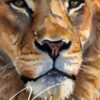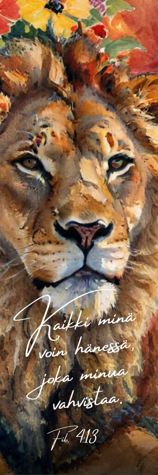 Kaunis kiiltäväpintainen kartonkinen kirjanmerkki, jossa leijonan kuva ja teksti: