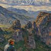 Kaunis kiiltäväpintainen kartonkinen kirjanmerkki, jossa kuva miehestä vuoristomaisemassa ja teksti: